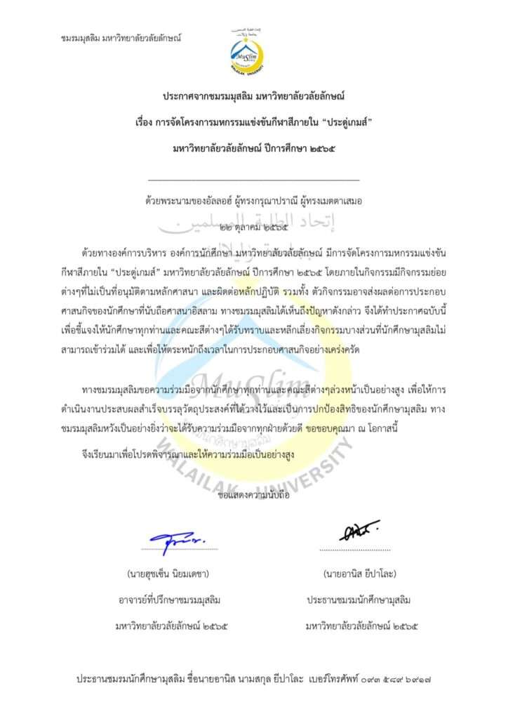 Statement by the Walailak University Student Organization Administration