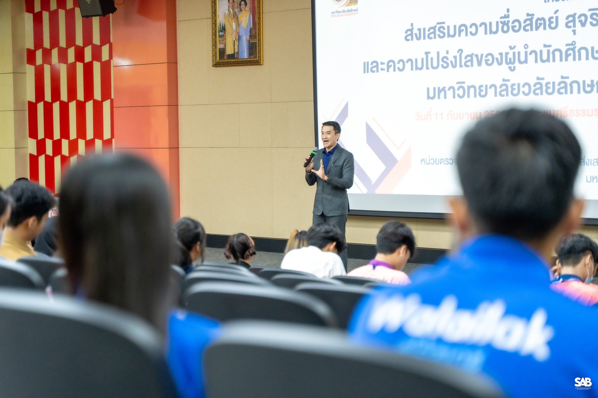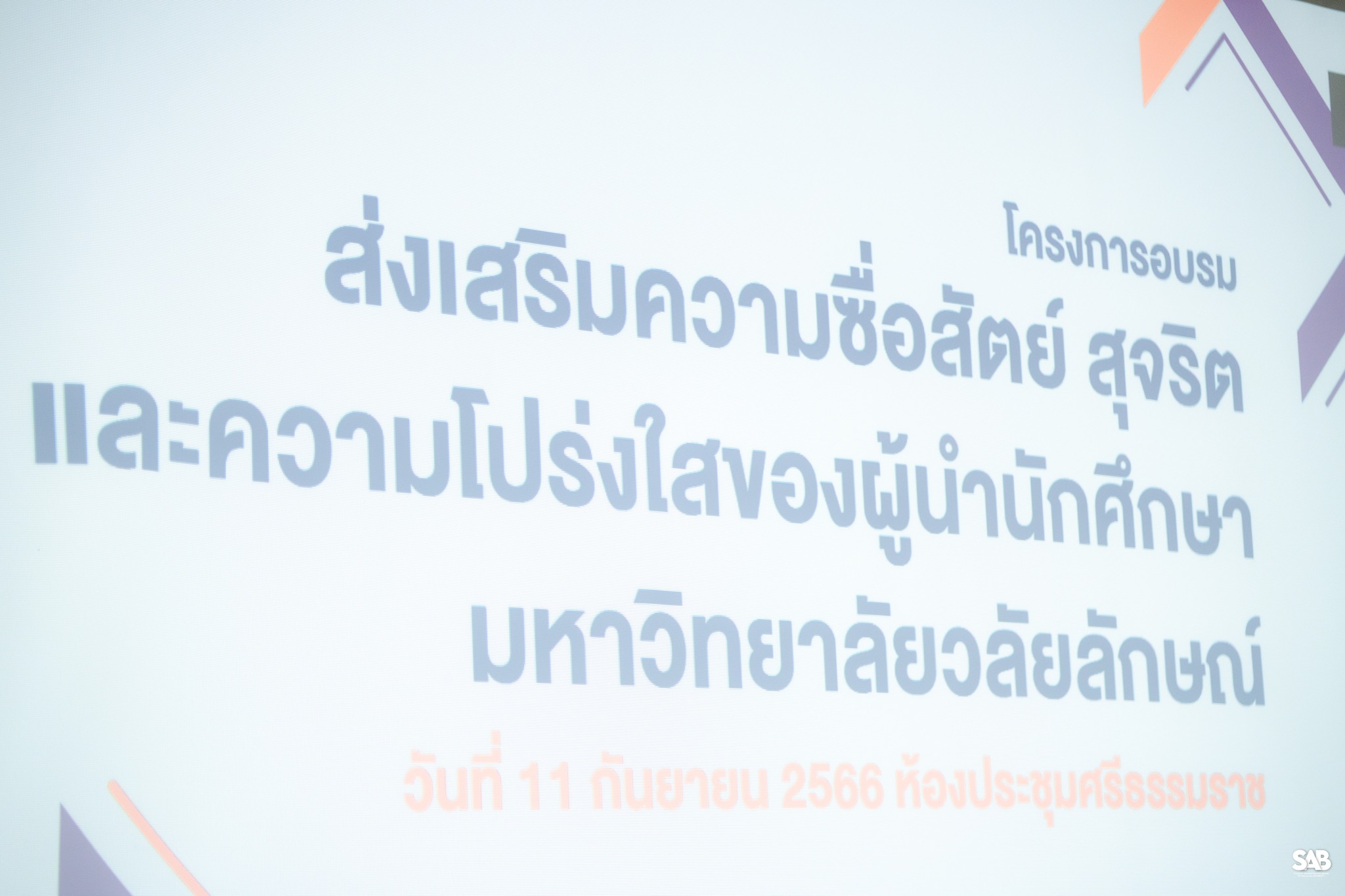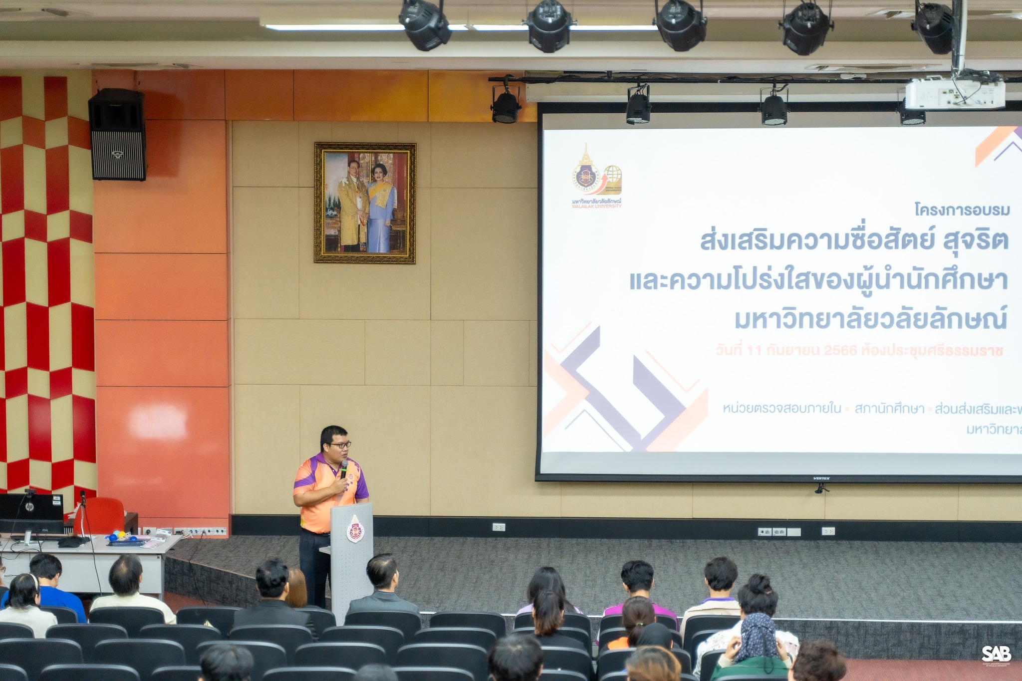 วันนี้ (วันที่ 11 กันยายน 2566) ส่วนส่งเสริมและพัฒนานักศึกษา (สพน.) ร่วมมือกับสภานักศึกษา มหาวิทยาลัยวลัยลักษณ์ จัดโครงการอบรมส่งเสริมความสื่อสัตย์ สุจริต และความโปร่งใสของผู้นำนักศึกษา มหาวิทยาลัยวลัยลักษณ์ กล่าวเปิดโดย รศ.ดร.วรวุฒิ สมศักดิ์ รักษาการแทนรองอธิการบดี มหาวิทยาลัยวลัยลักษณ์ และเจ้าหน้าที่สพน. ณ หอประชุมศรีธรรมราช อาคารสถาปัตยกรรมและการออกแบบ มหาวิทยาลัยวลัยลักษณ์