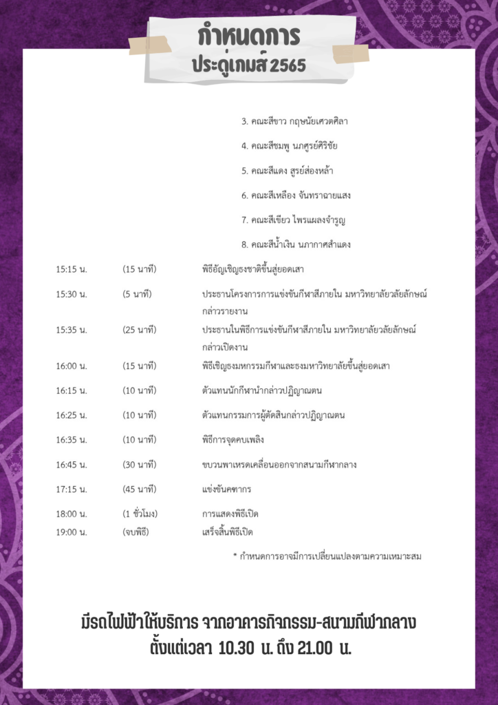 กำหนดการ #พิธีเปิด การแข่งกีฬาภายใน มหาวิทยาลัยวลัยลักษณ์ ประจำปีการศึกษา 2565 ใน วันที่ 20 พฤศจิกายน 2565 ณ สนามกีฬากลาง มหาวิทยาลัยวลัยลักษณ์