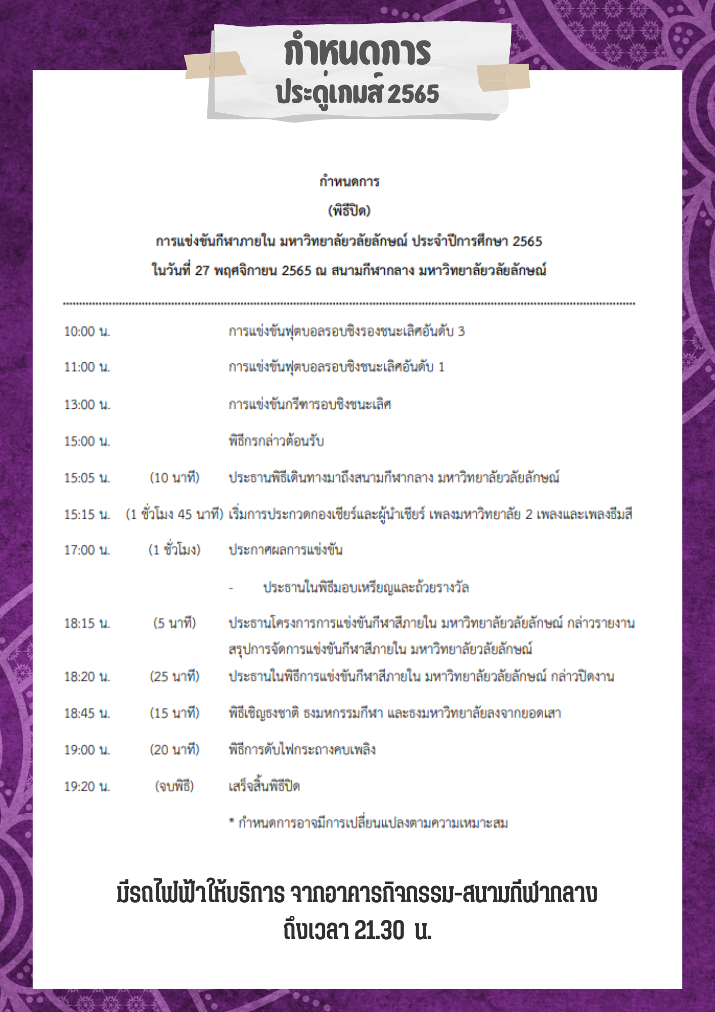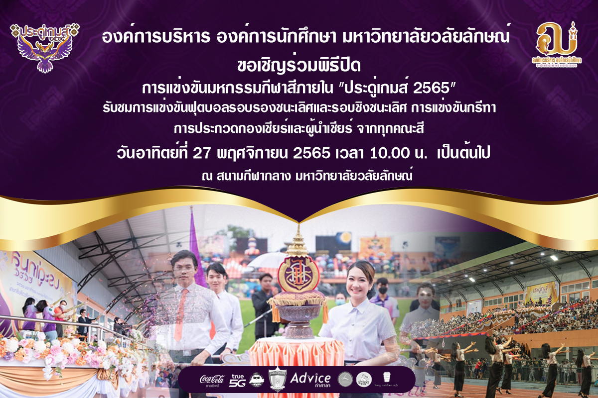 ขอเชิญร่วม พิธีปิด การแข่งขัน มหกรรมกีฬาสีภายใน “ประดู่เกมส์2565” ใน วันอาทิตย์ ที่ 27 พฤศจิกายน 2565 เวลา 10.00 น. เป็นต้นไป โดยในงานจะมีการแข่งขันฟุตบอลรอบชิงชนะเลิศ การแข่งขันกรีฑารอบชิงชนะเลิศ และที่พลาดไม่ได้ การแข่งขันกองเชียร์และผู้นำเชียร์จากทุกคณะสีณ สนามกีฬากลาง มหาวิทยาลัยวลัยลักษณ์ สำหรับการเดินทางมีพื้นที่จอดรถสะดวกสบาย มีรถไฟฟ้าให้บริการ ถึงเวลา 21.30 น.