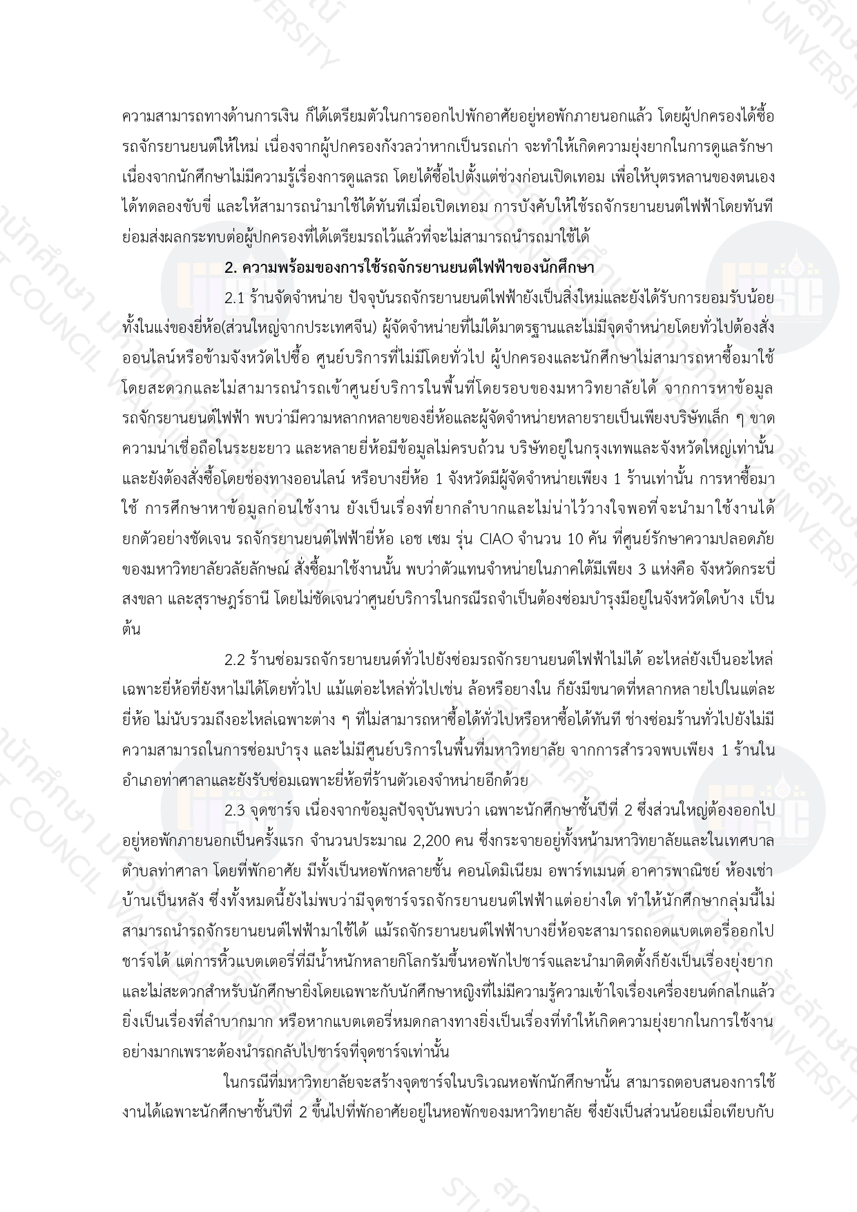 2.4 ราคารถจักรยานยนต์ไฟฟ้า โดยรถจักรยานยนต์ไฟฟ้าที่จดทะเบียนได้ตามมาตรฐานของกรมการขนส่งทางบกส่วนใหญ่จะยังมีราคาที่แพงมาก (45,000 – 100,000 บาท) และหลายยี่ห้อที่จัดจำหน่ายทางออนไลน์เนื่องจากไม่มีผู้จัดจำหน่ายโดยทั่วไป หลายยี่ห้อยังบอกรายละเอียดไม่ชัดเจนว่าจะสามารถจดทะเบียนได้หรือไม่ หากนักศึกษาซื้อและนำมาใช้ ในกรณีเป็นรถจักรยานยนต์ไฟฟ้าที่ไม่สามารถจดทะเบียนกับกรมการขนส่งทางบกได้ ก็จะไม่สามารถขึ้นทะเบียนกับมหาวิทยาลัยได้ ไม่สามารถซื้อ พรบ.คุ้มครองผู้ประสบภัยจากรถได้ หากเกิดอุบัติเหตุขึ้นมาก็ย่อมเกิดปัญหาใหญ่ต่อนักศึกษาและผู้ใช้รถร่วมเส้นทาง