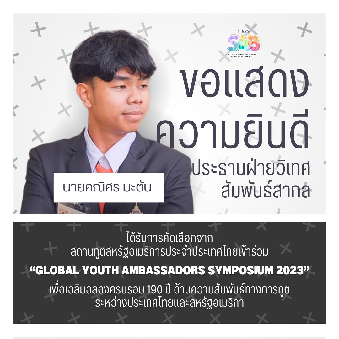 นายคณิศร มะตัน คณะกรรมการองค์การบริหาร องค์การนักศึกษา ฝ่ายวิเทศสัมพันธ์สากล และ นายพิจักษณ์ นาปะศรี นักศึกษารัฐศาสตร์ ได้รับการคัดเลือกจากสถานทูตสหรัฐอเมริการประจำประเทศไทย เข้าร่วม“Global Youth Ambassadors Symposium 2023” เพื่อเฉลิมฉลองครบรอบ 190 ปี ด้านความสัมพันธ์ทางการทูตระหว่างประเทศไทยและสหรัฐอเมริกา โดยเปิดโอกาสให้นักศึกษาที่ผ่านมาคัดเลือกจากสถาบันที่จัดการเรียนการสอนระดับปริญญาตรี สาขารัฐศาสตร์ ความสัมพันธ์ระหว่างประเทศทั่วประเทศ 20 สถาบัน มาร่วมแลกเปลี่ยนความรู้ ความเห็นด้านความสัมพันธ์ระหว่างประเทศสถานการณ์โลก ร่วมหาทางออกให้กับความท้าทายและปัญหาระดับโลก จัดงานโดยคณะศิลปศาสตร์ มหาวิทยาลัยธรรมศาสตร์ ร่วมกับสถานทูตสหรัฐอเมริกาประจำประเทศไทย